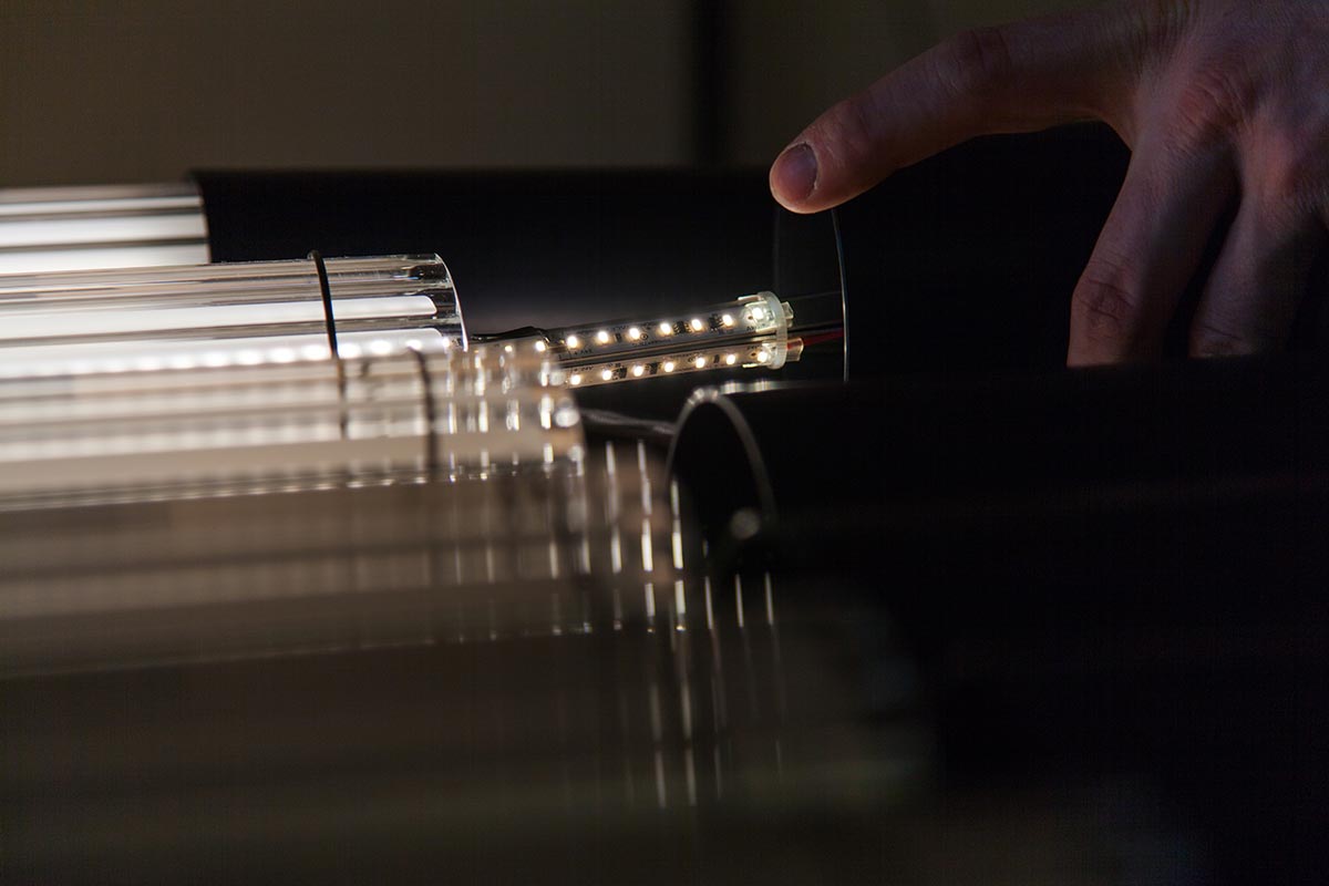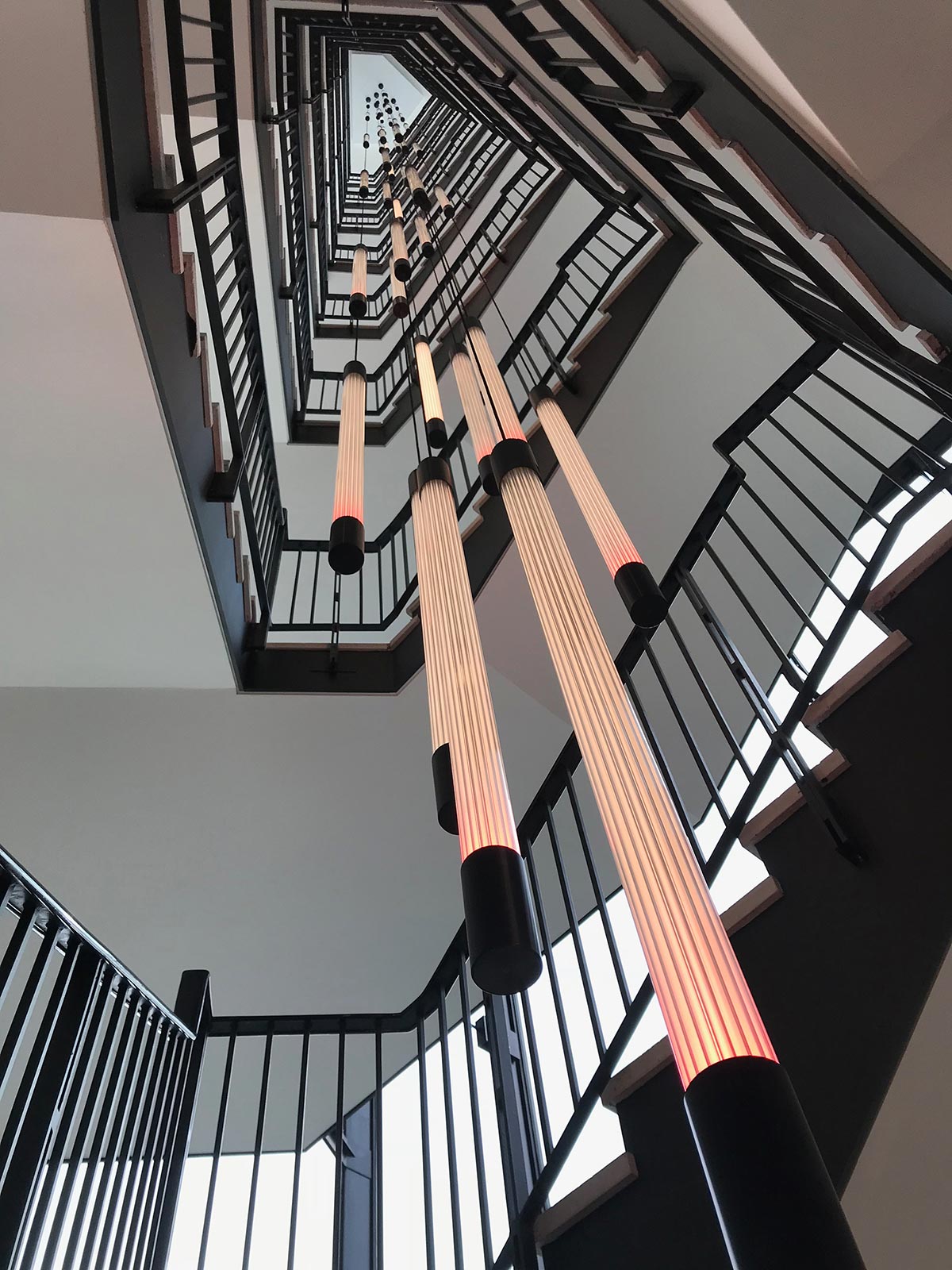 Descending almost 30 metres, the perspective is almost infinite when viewed from the ground floor – each fluted glass and black anodised construction gently illuminating the dramatic staircase that frames them.Every Bauhaus pendant is a bespoke assembly of Schott Conturax fluted glass tube, housing an array of efficient Tridonic EXC type LEDs at a neutral 3000K colour temperature.