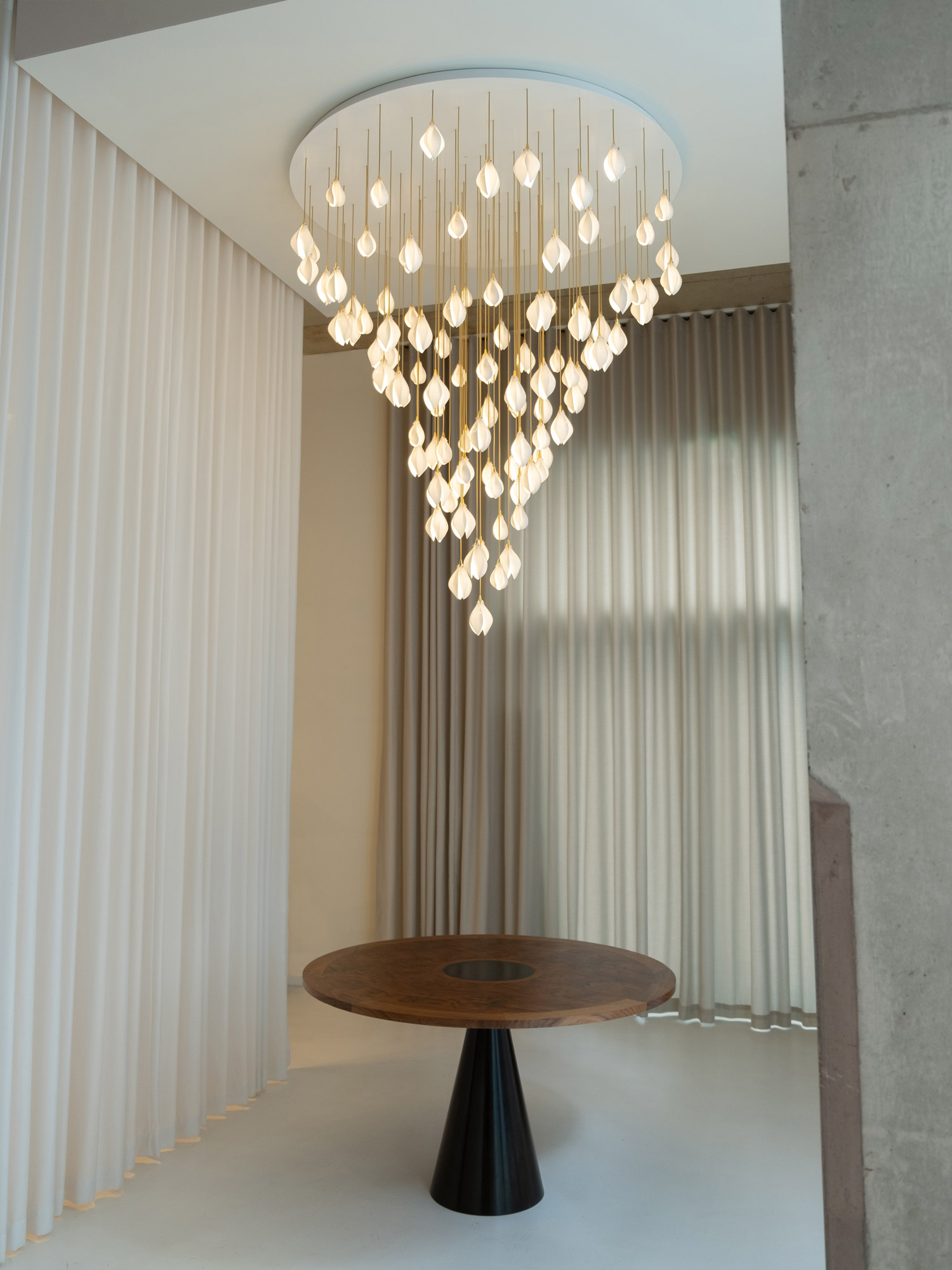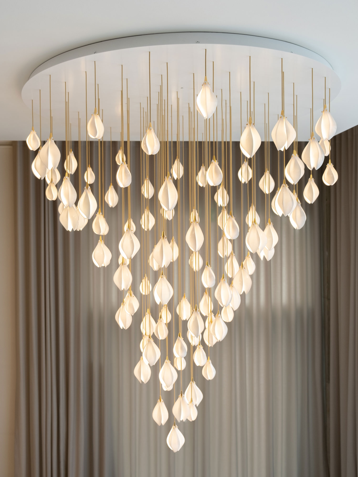 Each single flower has a unique character through its own delicate form: victoriously fragile, collectively radiant. Each Bloom bud captures this exquisite effect through delicate porcelain petals illuminated by integrated light sources to radiate warmth from the heart of the flower.