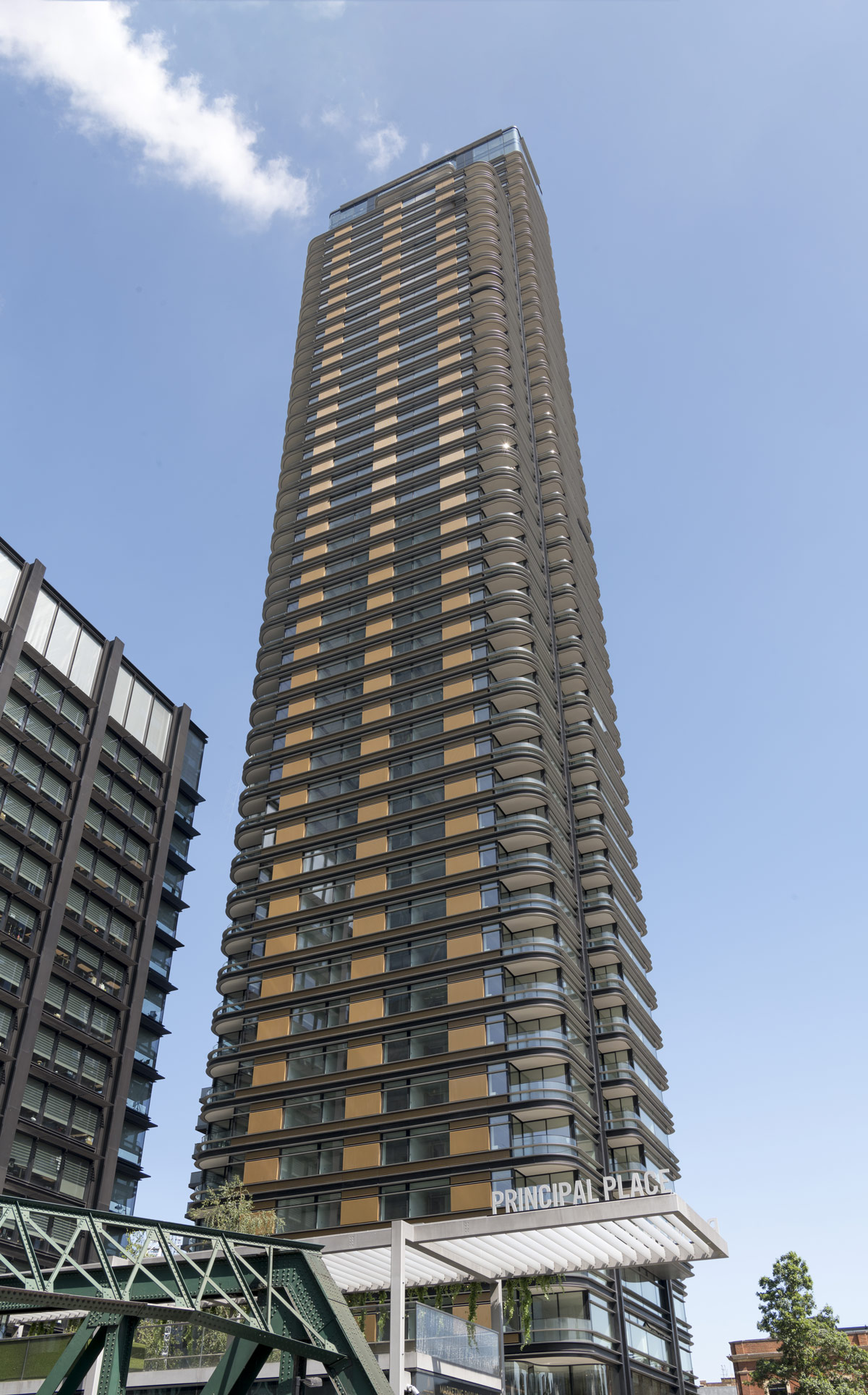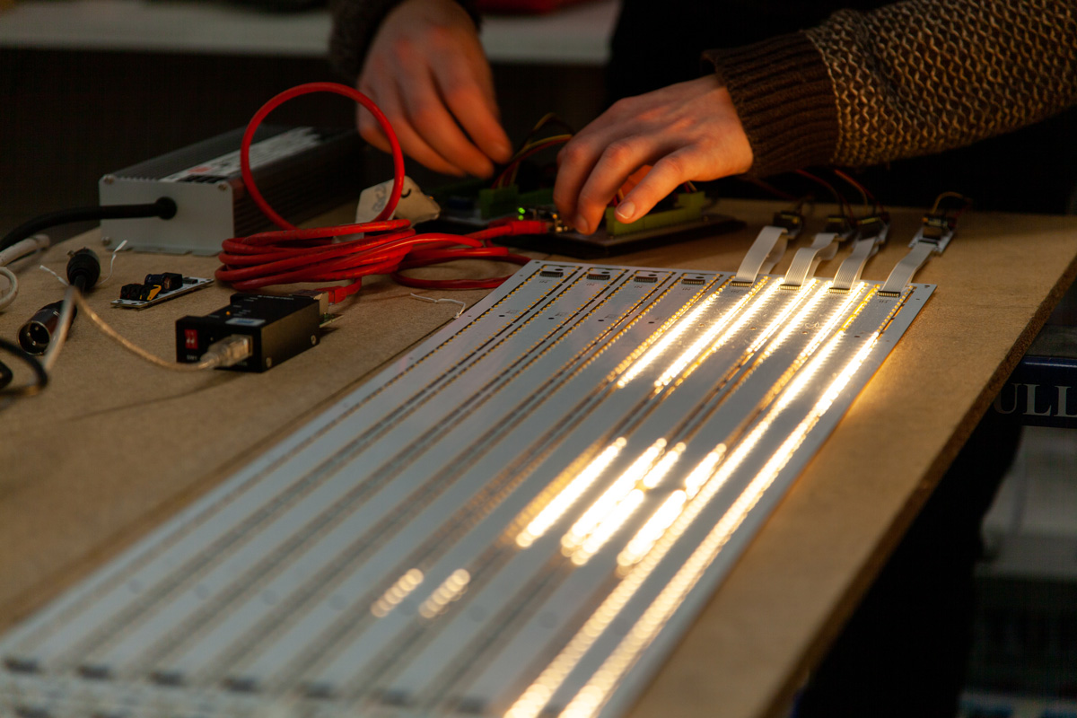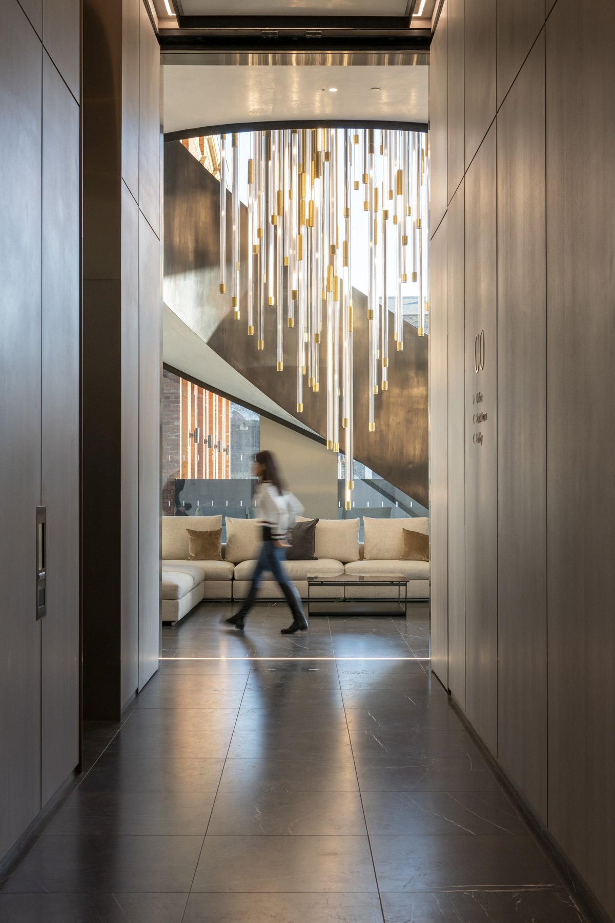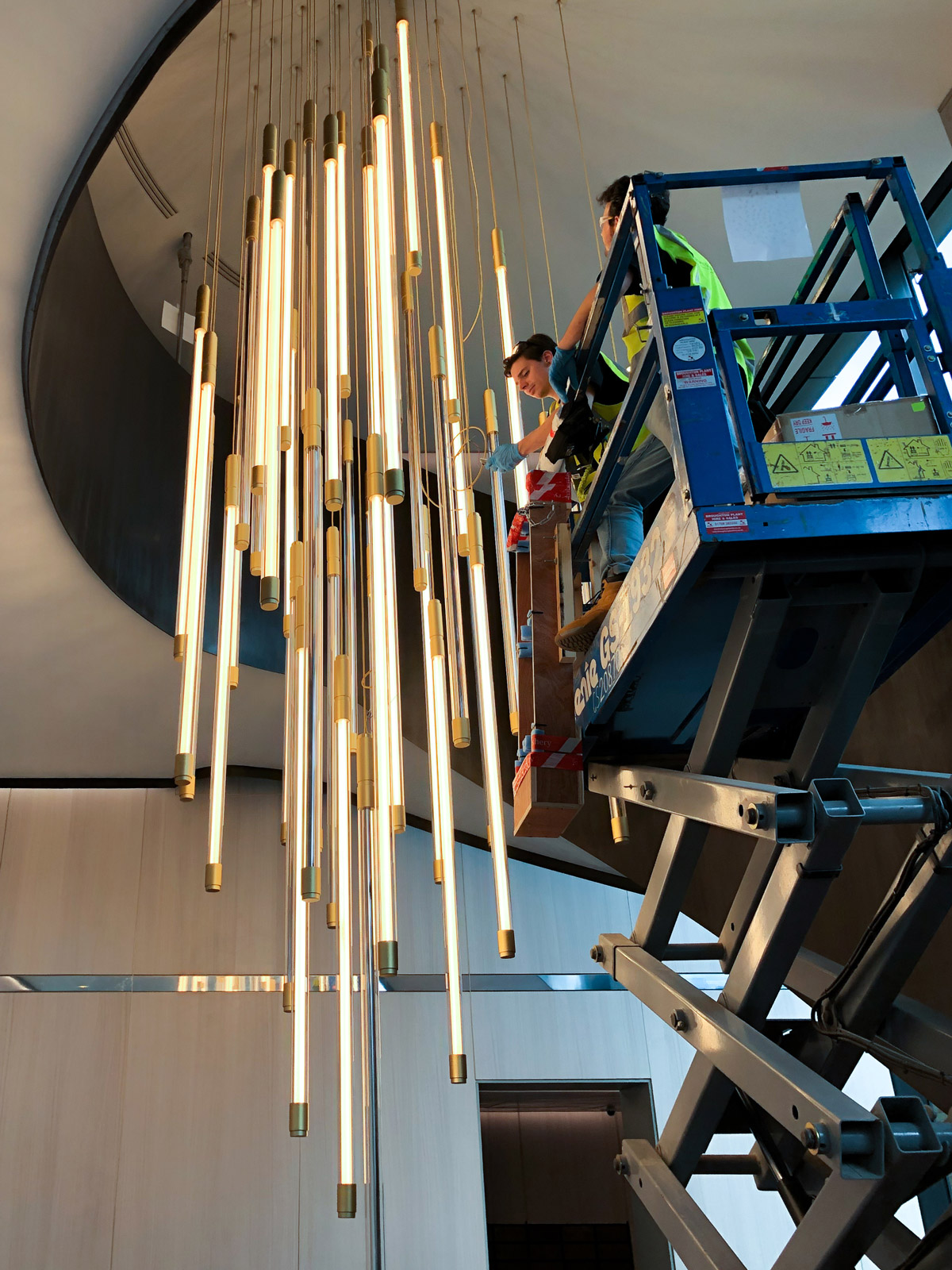 A dynamic light sculpture for the atrium of Foster + Partners’ Principal Tower. Using flowing sections of light through dozens of glass and reflective mirrored tubes, Flux creates a waterfall effect that cascades and dances across the reflective surfaces in the atrium.