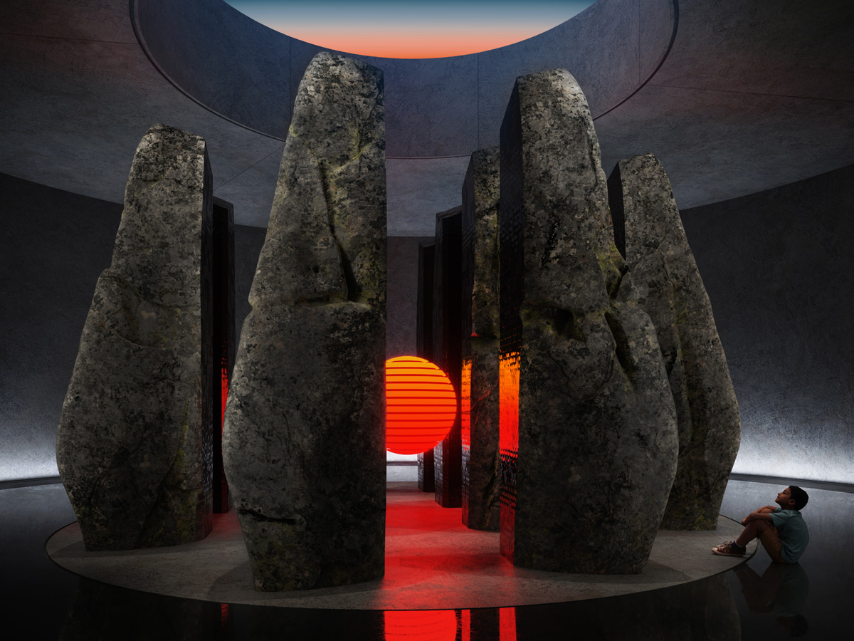 In the first of our sculptural concepts we configured a familiar Stonehenge circle of weather beaten, stone monoliths, aligned in a grid akin to Manhattan’s long avenues. The interior surfaces of each monolith are polished, referencing the textures and patterns that makeup the complex facades of the glass wrapped skyscrapers of the city.