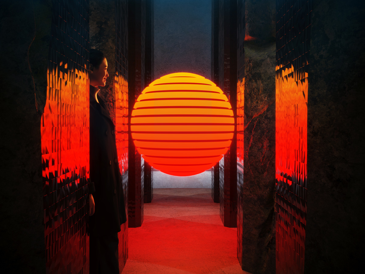 Nestled at the centre is a layered solar sphere, celebrating the tiers of warm hues synonymous with the setting sun, and reflecting off the polished surfaces creating mesmerising shimmers of colour.