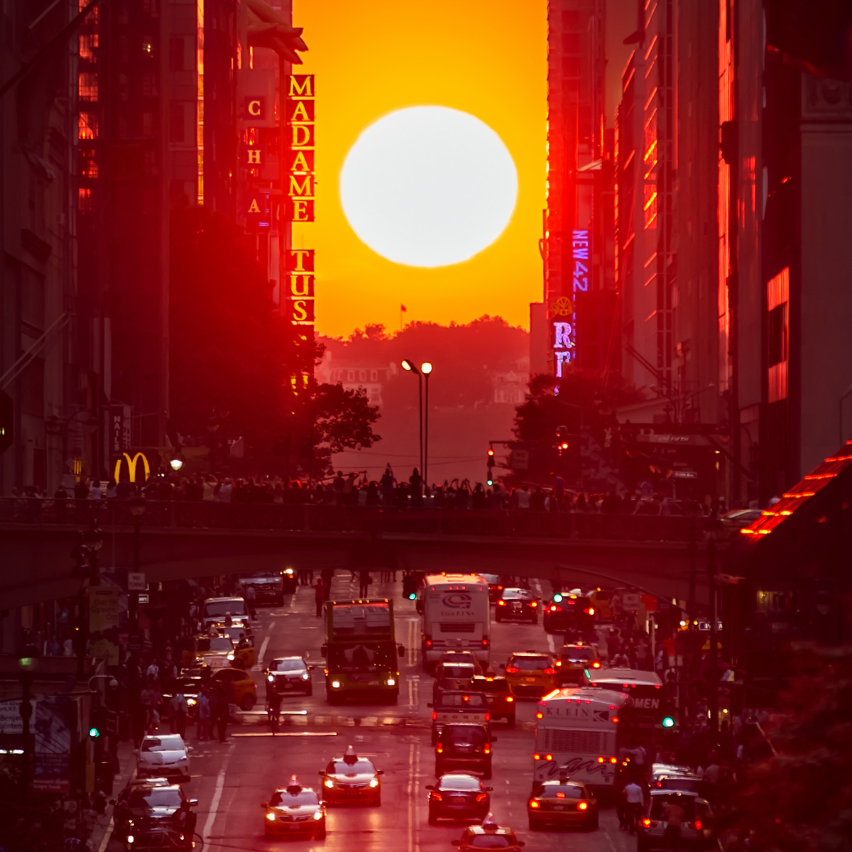 Manhattanhenge is a natural phenomenon occurring when the setting sun perfectly aligns with the east-west streets of Manhattan, drawing on age-old human desires to frame the sun and to respect its cyclical progression through our seasons.
