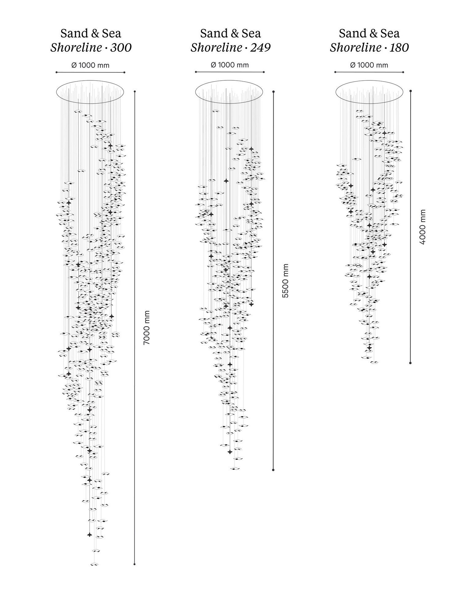 Sand & Sea’s standard suspended compositions are split into three sets characterised by their overall form: Shorelines, Cascading Waves and Rolling Waves.
